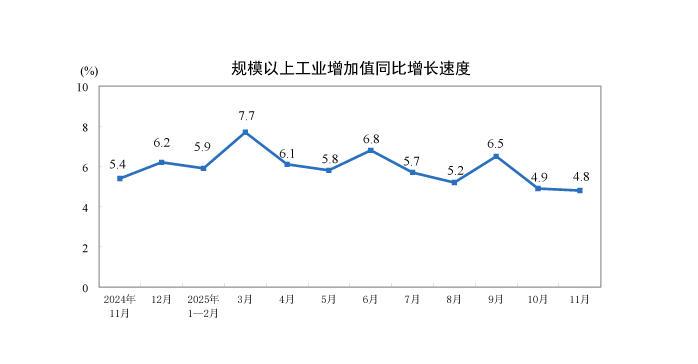12月15日电 据邦家统计局网站新闻,11月份,领域以上产业增进值共比本质增进4.8%(补充值删快均为扣除价钱要素的实践增进率)。从环比瞅,11月份,领域以上产业填补值比上月增进0.44%。1—11月份,范畴以上产业减少值共比增进6.0%。